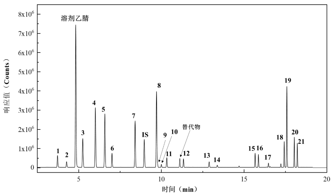 1—乙醚;2—丙酮;3—甲基叔丁基醚;4—二異丙基醚;5—乙基叔丁基醚;6—2-丁酮;7—甲基叔戊基醚;8—乙基叔戊基醚;9—2-戊酮;10—3-戊酮;11—甲基叔丁基酮;12—4-甲基-2-戊酮;13—2-己酮;14—環(huán)戊酮;15—3-庚酮;16—2-庚酮;17—環(huán)己酮;18—6-甲基-2-庚酮;19—二異丁基酮;20—3-辛酮;21—2-辛酮;IS—氟苯;替代物—4-甲基-2-戊酮-d5