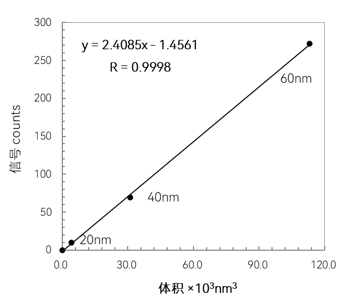單位時間檢測到的脈沖數(shù)與待測水相懸浮液中納米顆粒的數(shù)量成正比。計算濃度時,使用納米顆粒標(biāo)準(zhǔn)樣品確定傳輸效率。脈沖強度、脈沖面積與納米顆粒中被測元素的質(zhì)量,即納米顆粒直徑的立方成正比(假定納米顆粒的幾何形狀是球形)。隨著納米顆粒的直徑增大,信號響應(yīng)值將按三次方增加,所以需要對納米顆粒每種組成、每種尺寸范圍的響應(yīng)進行驗證。校準(zhǔn)一般推薦使用納米顆粒標(biāo)準(zhǔn)樣品,無法獲得這樣的標(biāo)準(zhǔn)樣品時,在相同的樣品分析條件下,使用被測元素的離子標(biāo)準(zhǔn)溶液進行此步驟中的校準(zhǔn)。此外,還可根據(jù)背景濃度的響應(yīng)值確定樣品中存在的離子質(zhì)量濃度。