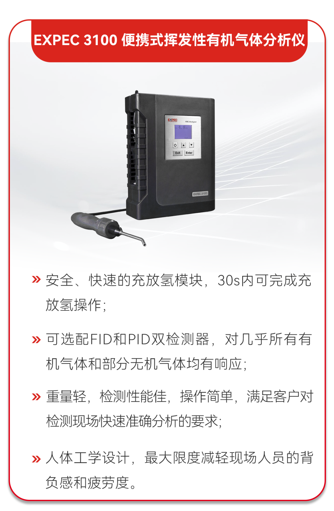 聚光科技化工園區(qū)便攜式VOCs檢測技術(shù)為化工園區(qū)實施VOCs污染精細化管控及環(huán)境突發(fā)應(yīng)急監(jiān)測提供科技支撐保障。該檢測技術(shù)主要由EXPEC 3100便攜式揮發(fā)性有機氣體分析儀和EXPEC 3500便攜式氣相色譜-質(zhì)譜聯(lián)用儀組成,助力園區(qū)管理部門實現(xiàn)對低揮發(fā)性有機物(VOCs)的自主監(jiān)測,能有效滿足環(huán)境VOCs監(jiān)測設(shè)備“科技化、精準化、智慧化”需求,提升監(jiān)測效能,為保障空氣質(zhì)量提供強有力支撐。便攜式VOCs檢測技術(shù)充分利用兩種不同便攜產(chǎn)品的優(yōu)勢,既能對無組織泄露進行快速檢測,消除潛在危險,又能實現(xiàn)VOCs定性定量分析,對污染物精準溯源,為化工園區(qū)環(huán)境監(jiān)測監(jiān)管提供強大技術(shù)支持。設(shè)備采購成本低:僅為設(shè)備購買費用及相關(guān)耗材費用等,耗材也均為原廠生產(chǎn),價格相對較低;運行維護費用低:均為自主研發(fā)產(chǎn)品,智能化程度高,維護工作量小;售后服務(wù)保障全:12個月質(zhì)保期,終身免費維修(僅收取備件費用);