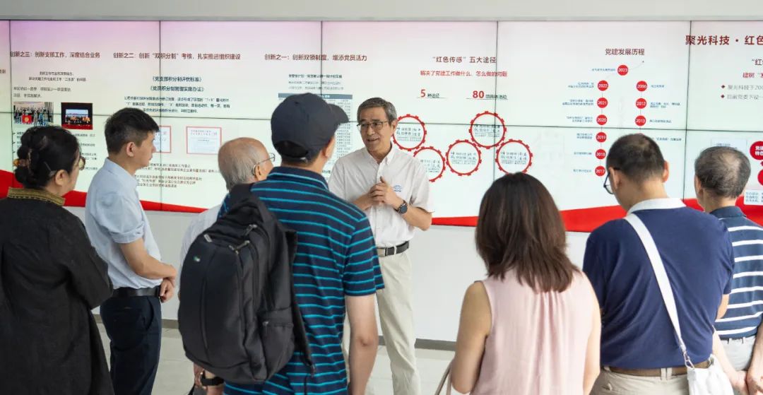 專家考察團(tuán)一行參觀了聚光科技綠色科技展廳,陳熒平首先簡要介紹了聚光科技黨建的發(fā)展歷程、“紅色傳感”黨建品牌,以及雙領(lǐng)制、雙積分制、與業(yè)務(wù)深度結(jié)合的特色做法。