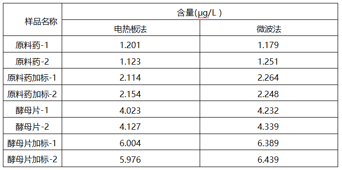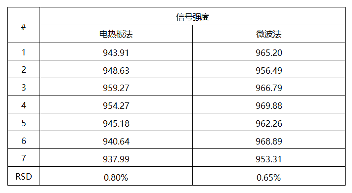 電熱板法:將樣品搖勻,取0.05g樣品置于50mL燒杯中,加玻璃珠數(shù)粒,加入6mL鹽酸和2mL硝酸,放置過夜,加蓋緩慢加熱消化至無色澄清溶液,去蓋140℃趕酸至液體剩余 1mL左右,沿壁加入5mL鹽酸、液體體積接近1mL時,待取下冷卻,將溶液完全轉(zhuǎn)移至50mL容量瓶中,用5%鹽酸溶液洗滌燒杯,并將洗滌液合并入容量瓶中,用5%鹽酸定容,搖勻。