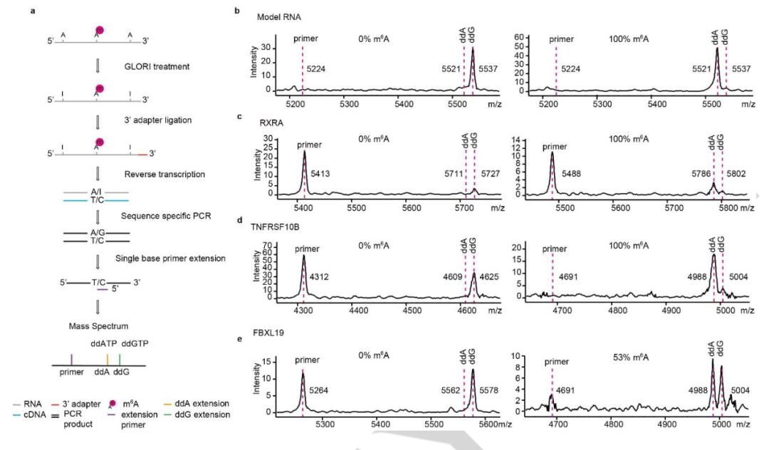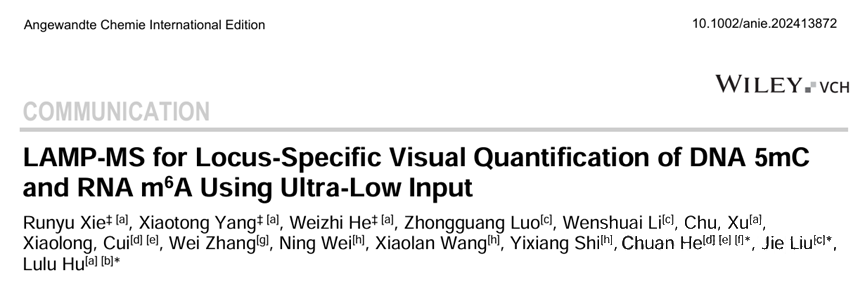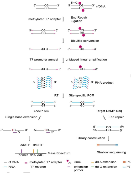 2024年11月4日,國際化學類頂級期刊《德國應用化學國際版》(Angewandte Chemie-international Edition)(IF 16.1)上發(fā)表了題為《LAMP-MS for Locus-Specific Visual Quantification of DNA 5mC and RNA m6A Using Ultra-Low Input》的研究論文。報道了一種基于核酸質譜平臺的創(chuàng)新甲基化檢測方法,該工作由復旦大學醫(yī)學院胡璐璐研究員團隊、華山醫(yī)院消化科劉杰主任團隊、美國芝加哥大學何川院士團隊攜手柏锘(上海)醫(yī)療科技有限公司共同完成。 該研究中所使用的飛行時間質譜平臺為聚光科技生命科學板塊旗下聚致生物(GenWish)自主研發(fā)的GeneTOF 3100核酸質譜分析系統(tǒng)。 液體活檢技術通過收集血液中來自各種組織的游離DNA(cfDNA),對其中包含的生物標志物(如基因突變、甲基化或羥甲基等表觀修飾)進行檢測,具有無創(chuàng)、高效的特點。與傳統(tǒng)的各種檢測技術(例如胃腸鏡、血清標志物)相比,液體活檢在臨床上具有革命性的優(yōu)勢,在癌癥等疾病的早篩早診、預后監(jiān)測、療效評估等諸多方面有廣闊的應用前景。 DNA甲基化作為一種重要的表觀遺傳修飾,可在腫瘤發(fā)生的早期被檢測到,且具有較好的穩(wěn)定性,因此成為腫瘤液體活檢中一個極具價值的生物標志物。但是,目前基于亞硫酸氫鹽測序技術的甲基化檢測方法,很難避免DNA的降解;且高通量測序成本較高,實驗后的分析工作復雜;PCR檢測涵蓋的位點也有限,因此開發(fā)一種經(jīng)濟、可靠、通量靈活且能夠覆蓋多位點的新甲基化檢測方法,是非常具有意義的。 研究團隊開發(fā)的LAMP-MS方法創(chuàng)造性地將線性擴增和飛行時間質譜技術結合在一起,只需要1ng血漿cfDNA,通過多重PCR和單堿基引物延伸,能夠在較短時間內(nèi)同時檢測數(shù)十個甲基化位點。該技術主要操作步驟如圖1所示: LAMP-MS的完整工作流程