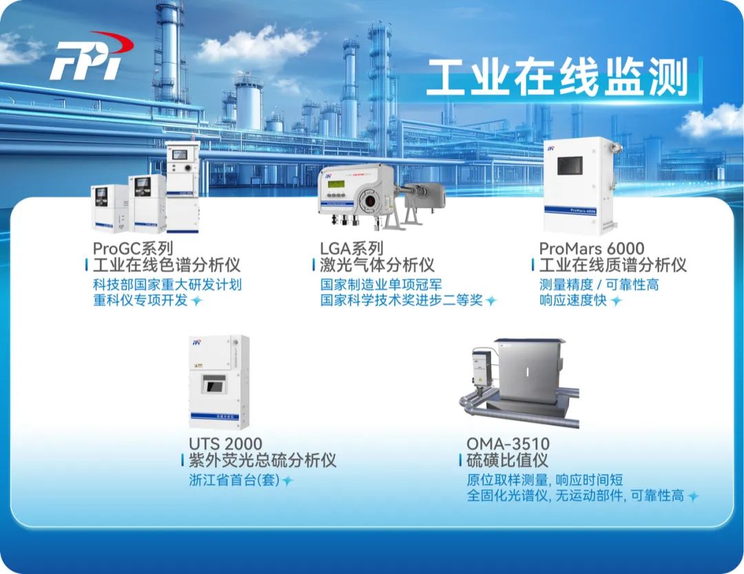 聚焦石油化工關(guān)鍵工藝,紫外熒光法總硫分析儀、激光氣體分析儀、硫磺比值儀、工業(yè)在線氣相色譜儀等儀器,精準監(jiān)測過程控制所需的各項關(guān)鍵組分,支持連續(xù)在線分析與過程聯(lián)動調(diào)控,為“提質(zhì)、降碳、穩(wěn)運行”提供連續(xù)可靠的數(shù)據(jù)支撐。