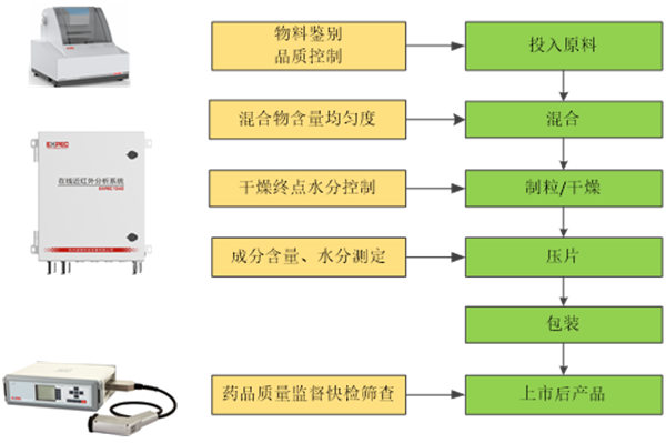 在制藥過程中,先采用臺式近紅外光譜分析儀對于進廠原料質(zhì)控,投料原料的鑒別分析,從源頭檢測把控;生產(chǎn)中混合均勻度的在線判斷,干燥過程中水分的在線監(jiān)測,采用在線近紅外分析儀進行監(jiān)測;最后采用便攜近紅外可對市場通中藥品進行質(zhì)量監(jiān)督快速篩查,從點到面,全過程保障藥品質(zhì)量。
