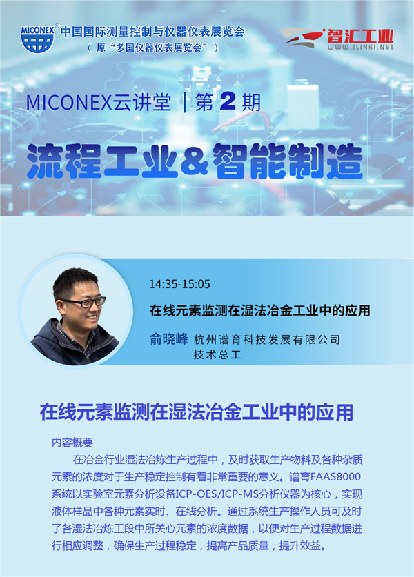 聚光科技旗下子公司杭州譜育科技發(fā)展有限公司(以下簡稱:譜育科技)技術(shù)總工俞曉峰和解決方案團(tuán)隊(duì)?wèi)?yīng)邀參加MICONEX云講堂第2期《流程工業(yè)&智能智造》,將圍繞《在線元素監(jiān)測在濕法冶金工業(yè)中的應(yīng)用》開展主題報(bào)告,在線幫助流程行業(yè)解決“數(shù)據(jù)實(shí)時(shí)性差、樣品代表性差”等難題,實(shí)現(xiàn)“生產(chǎn)工藝優(yōu)化,產(chǎn)品品質(zhì)提升”,滿滿干貨。